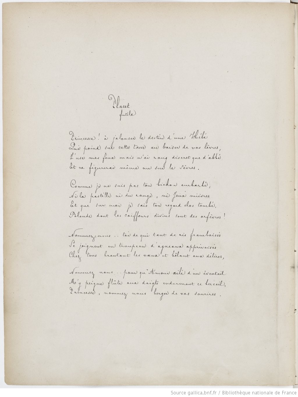| I | 2 4 | Princesse ! À jalouser le destin d'une Hébé Qui poind sur cette tasse au baiser de vos lèvres, J'use mes feux mais n'ai rang discret que d'abbé Et ne figurerai même nu sur le Sèvres. | |